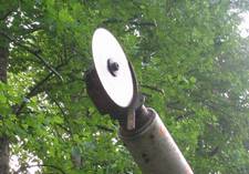 The secret is this – a carbide-tipped, approx 15 inch diameter saw blade! Mounted on the end of an approx 75 ft telescoping,
